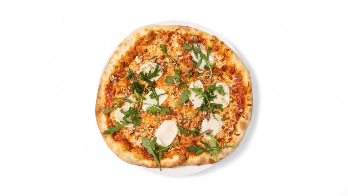 rajčatová omáčka, mozzarella, kozí sýr, vlašské ořechy, rukola, oregano