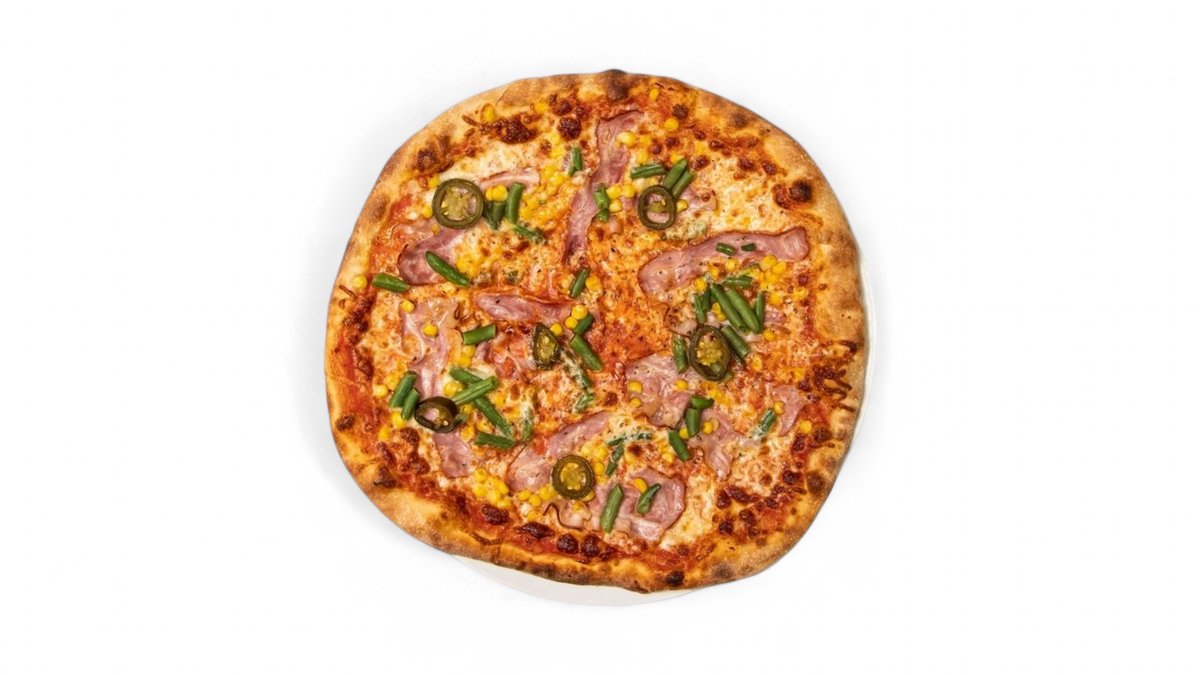 rajčatová omáčka, mozzarella, slanina, feferonky, kukuřice, fazolové lusky, oregano