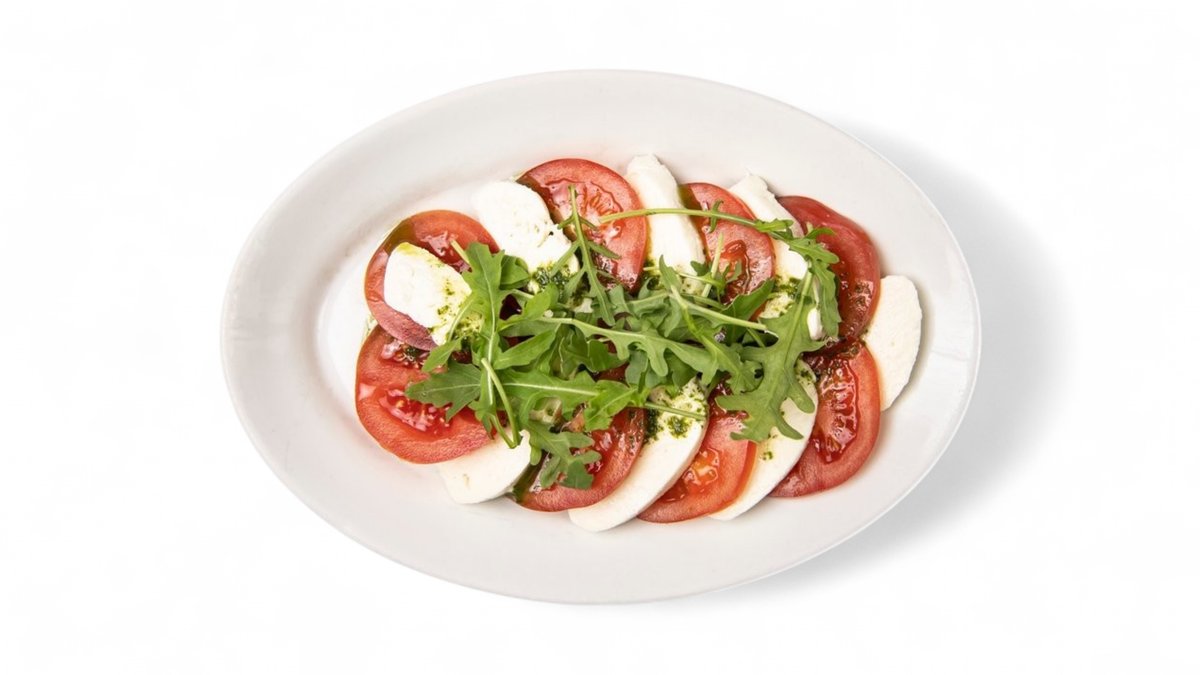 rajčata, mozzarella, domácí bazalkové pesto, rukola