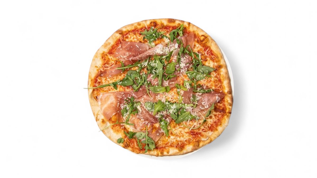 rajčatová omáčka, mozzarella, parmská šunka, rukola, parmazán, oregano