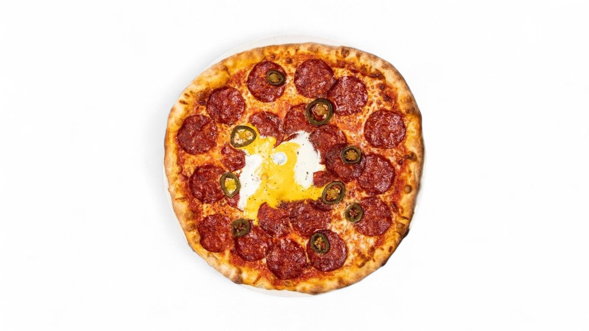 rajčatová omáčka, mozzarella, pikantní salám, feferonky, vejce, oregano
