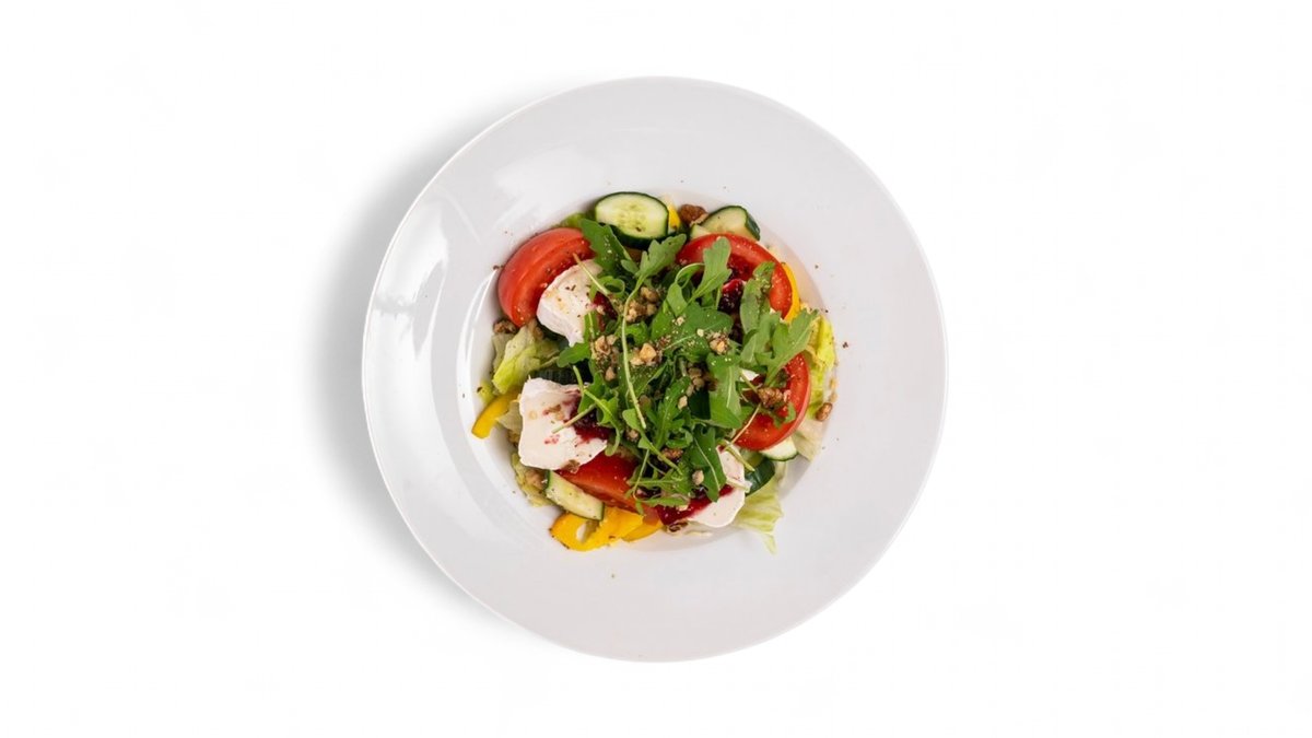 ledový salát, rukola, rajčata, okurka, paprika, kozí sýr, vlašské ořechy, brusinky, olivový olej