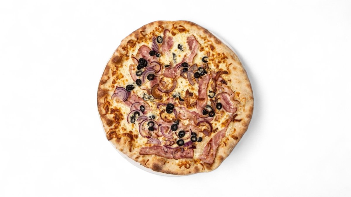 smetana, mozzarella, slanina, červená cibule, olivy, oregano