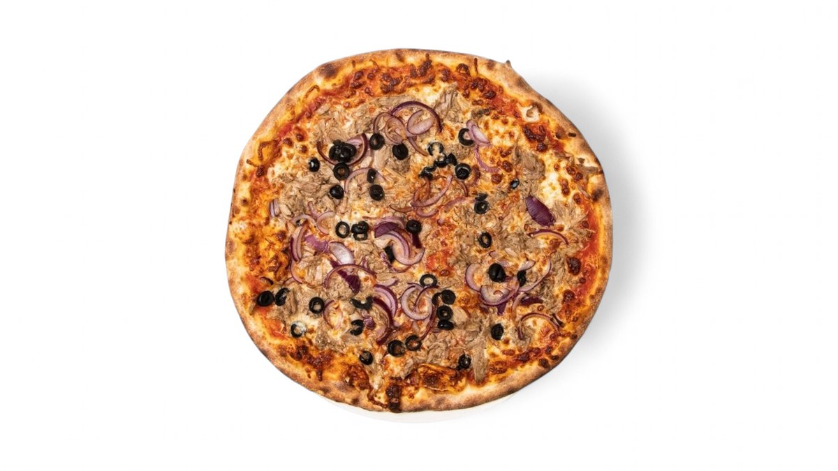 rajčatová omáčka, mozzarella, tuňák, červená cibule, olivy, oregano