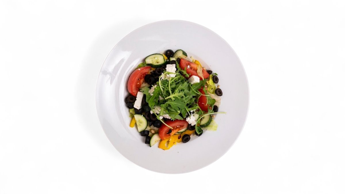ledový salát, rukola, rajčata, okurka, paprika, balkánský sýr, olivový olej