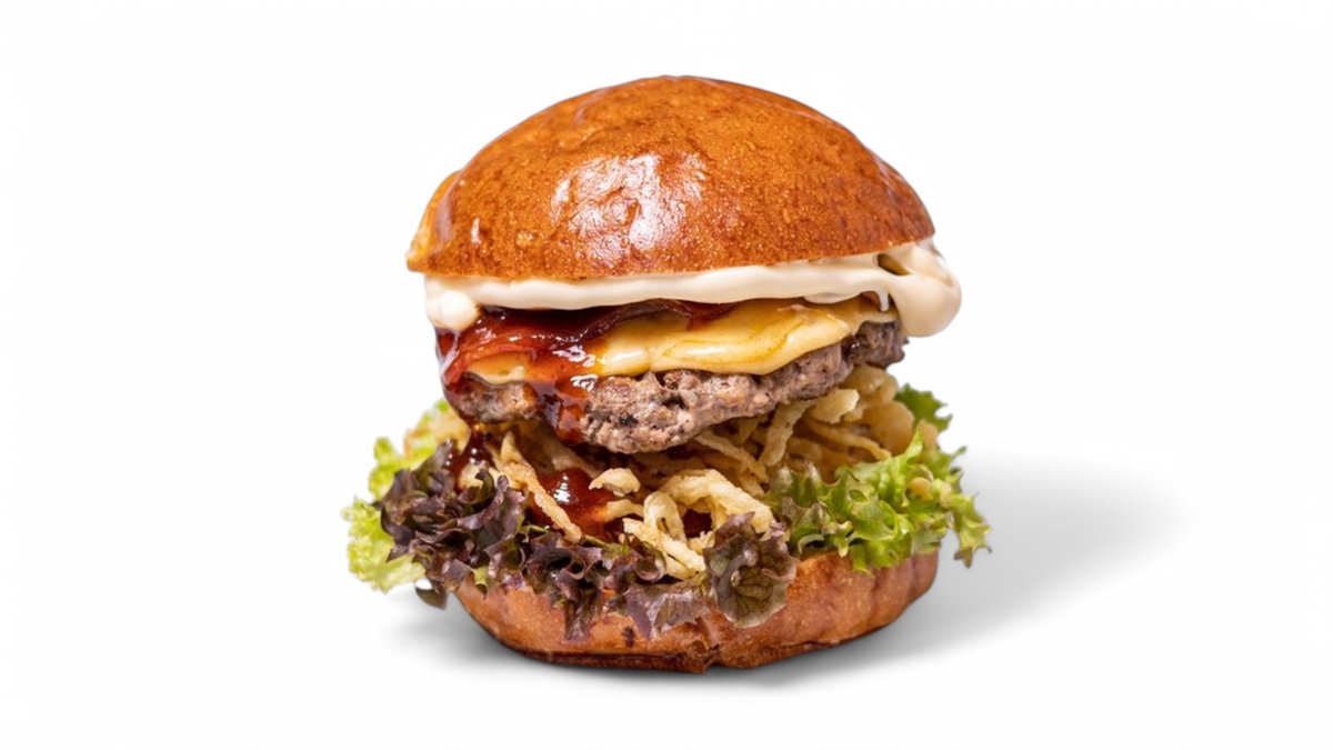 Kuřecí Burger Crispy (slanina,listový salát,rajče,cibule), hranolky