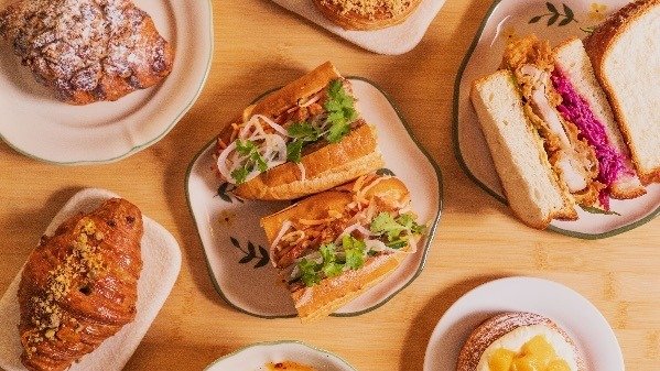 Discover the charm of a modern artisan bakery with a selection of crispy croissants, Vietnamese bánh mì baguettes, shokupan with fried chicken, and a variety of Danish pastries. 🥐🥖