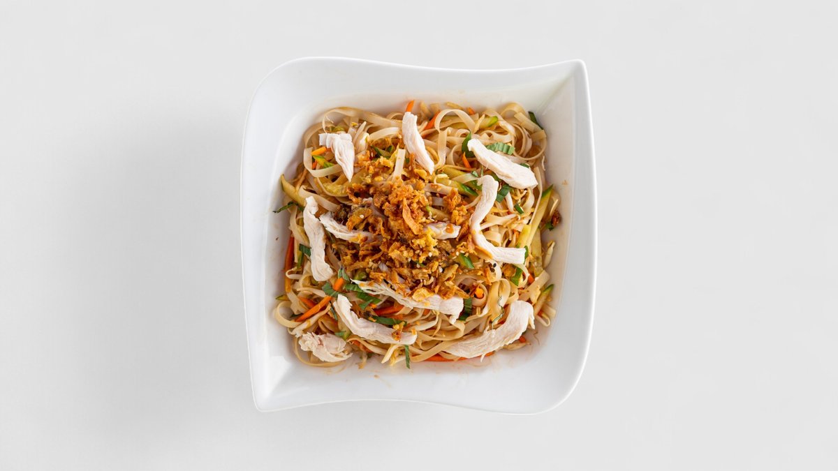 Grilované vepřové s rýžovými nudlemi, salátem a omáčkou