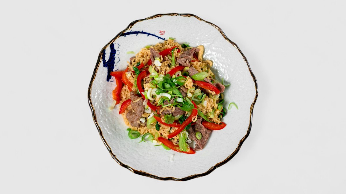 Smažené instantní nudle s hovězím nebo kuřecím masem