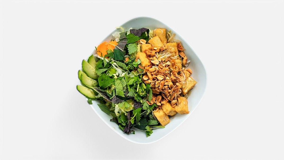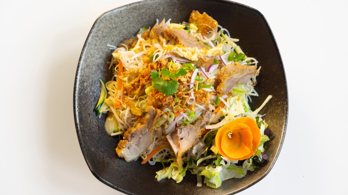 obalovaný losos v tempuře, sushi rýže, wakame salát, nakladaný ředkev, avokádo, okurka, sezam, teriyaki omáčka