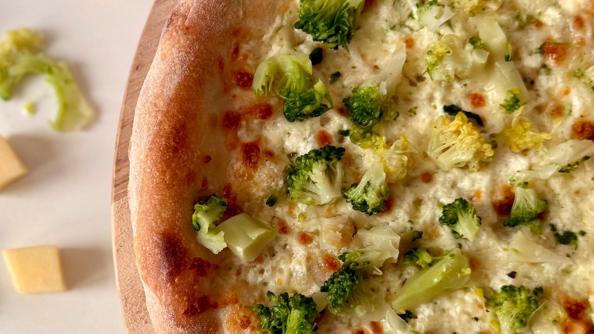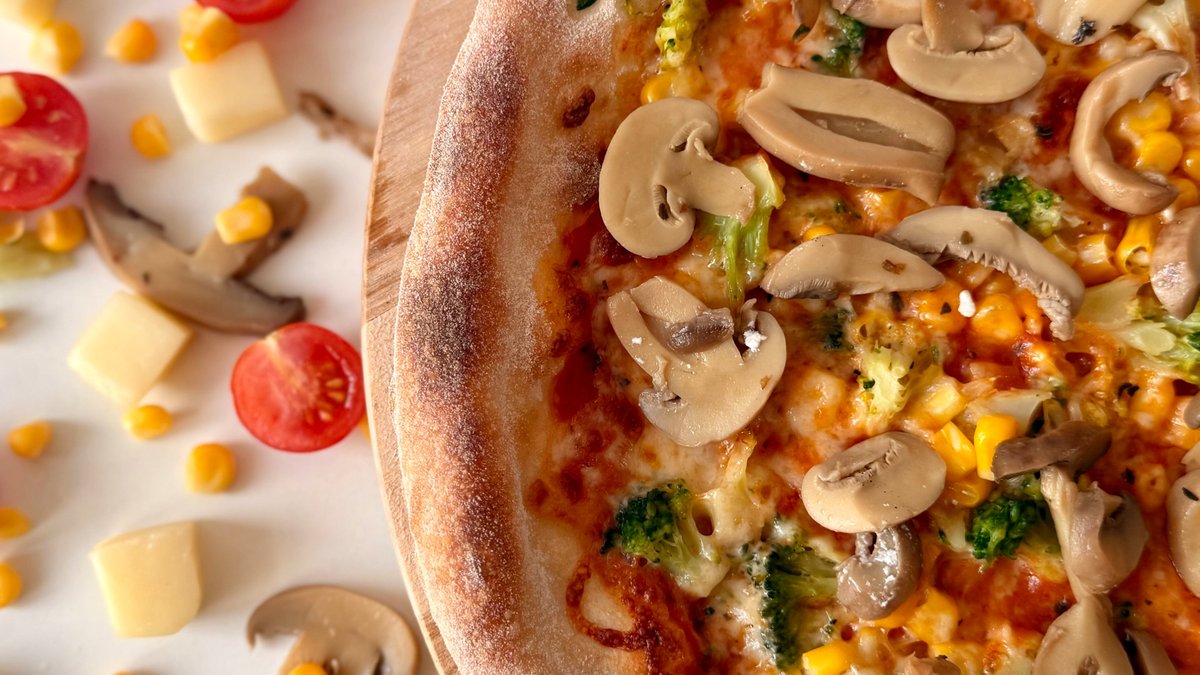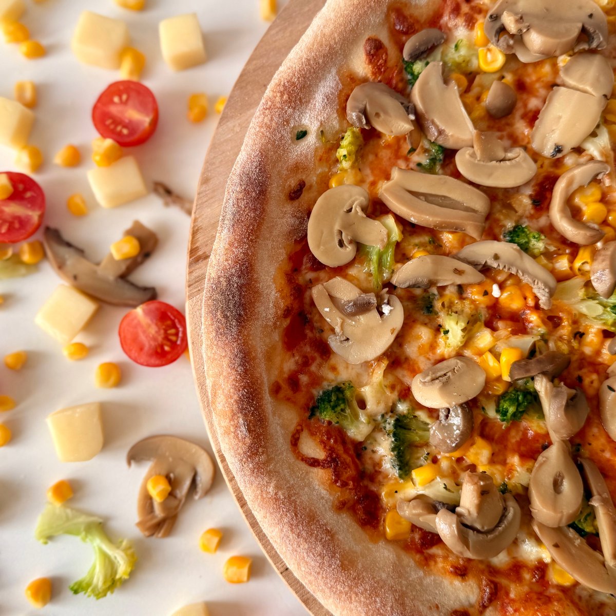Sugo, mozzarella, čerstvé žampiony, brokolice, paprika, kukuřice, česnek