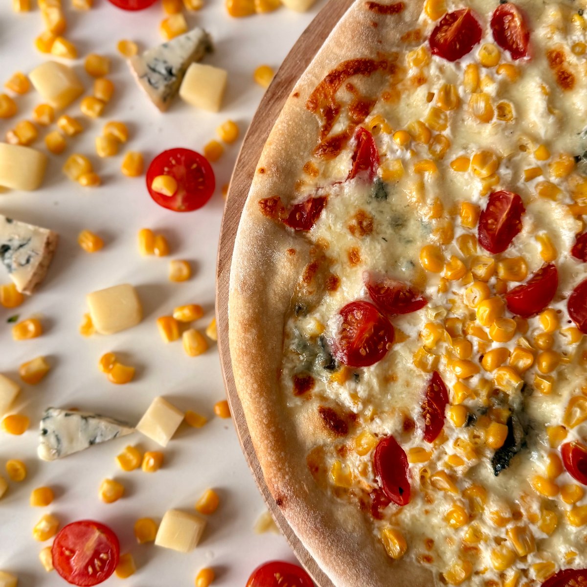 smetana, mozzarella, gorgonzola, kukuřice, cherry rajčata