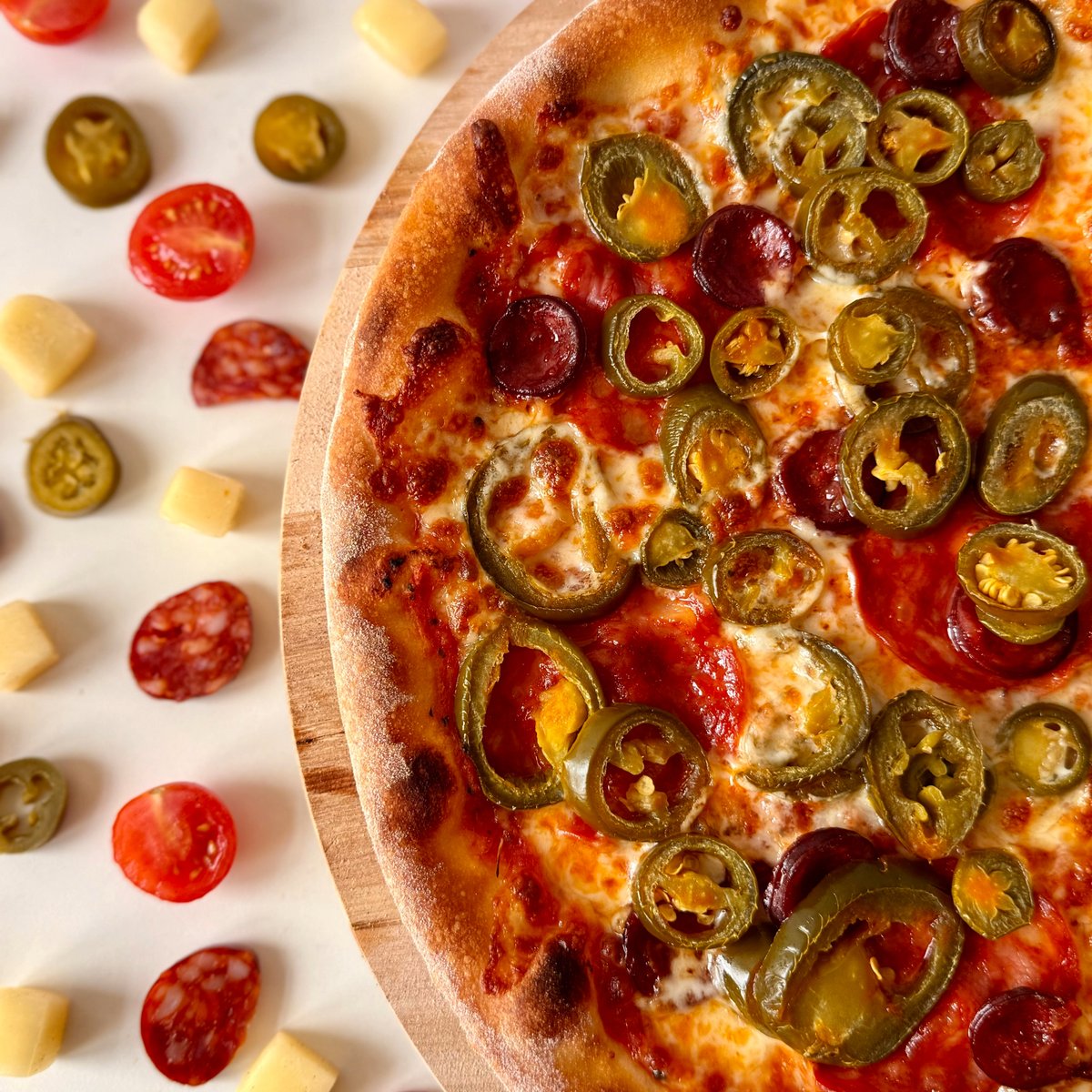Sugo, mozzarella, chorizzo, klobása, jalapenos, chilli, parmezán