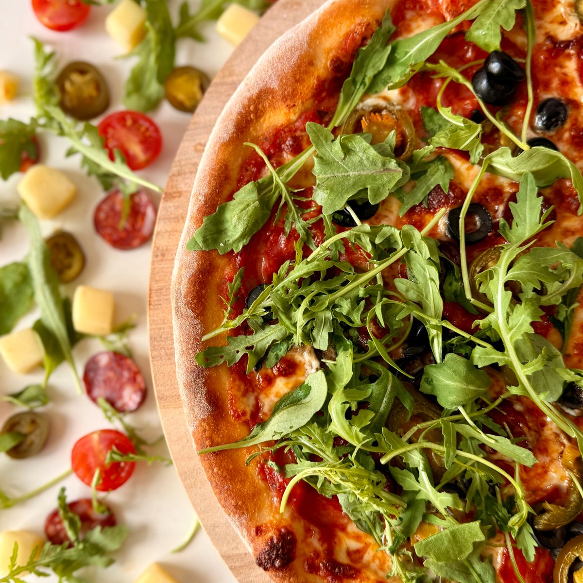 sugo, mozzarella, chorizo, klobása, jalapenos, olivy, rukola