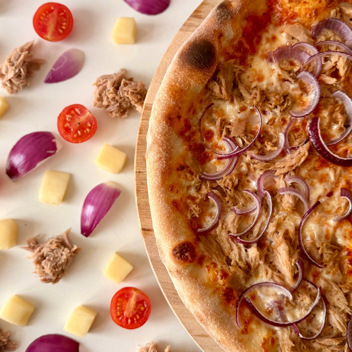 sugo, mozzarella, tuňák, červená cibule