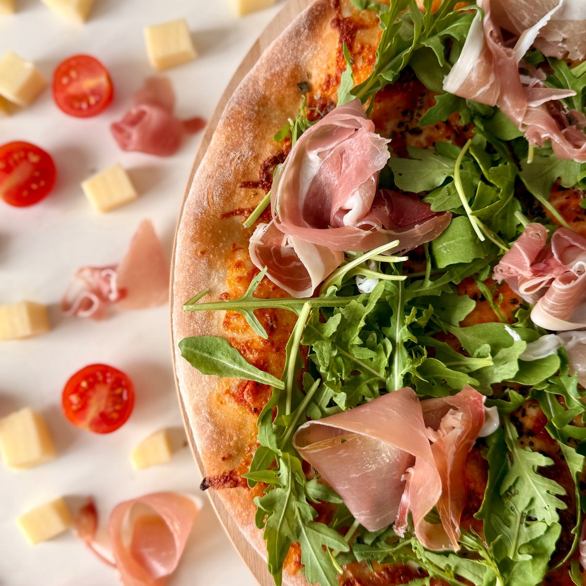 sugo, mozzarella, prosciutto crudo, rukola