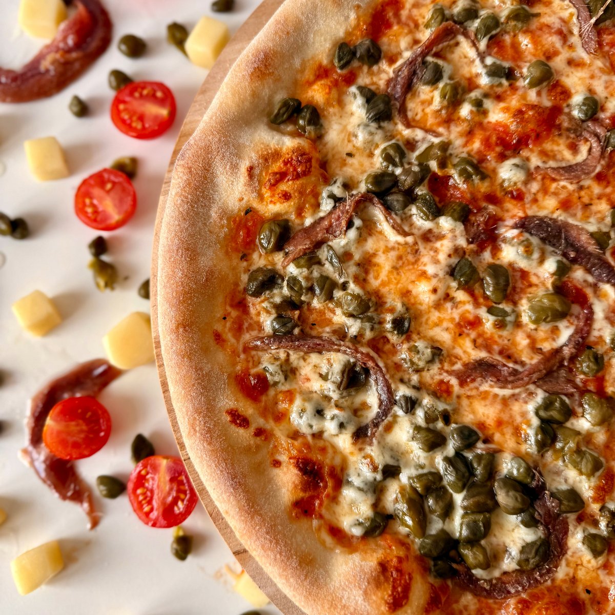 sugo, mozzarella, kapary, ančovičky, bazalka