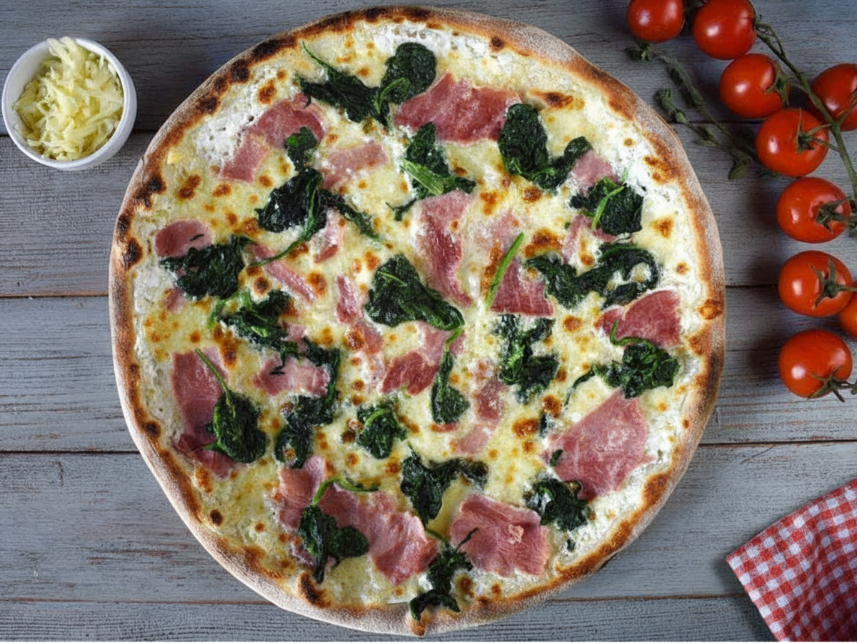 s rajčatovou omáčkou, listovým špenátem, cherry rajčaty, paprikou, olivami, česnekem, bazalkou a parmezánem