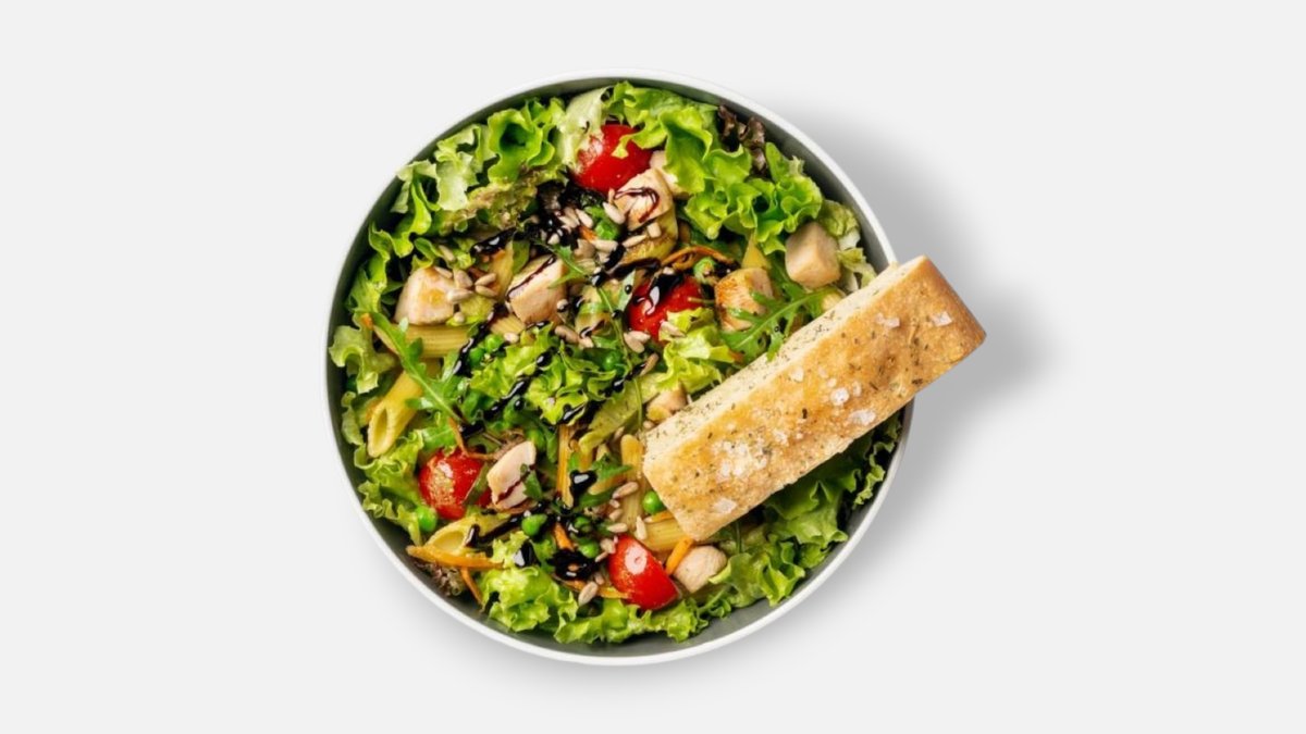 těstoviny penne, mix salátů, rukola, kuřecí prsa, cherry rajčata s hladkolistou petrželí, hrášek, mrkev, focaccia s bylinkami, slunečnicová semínka, balsamiková redukce, jarní ořechové pesto
