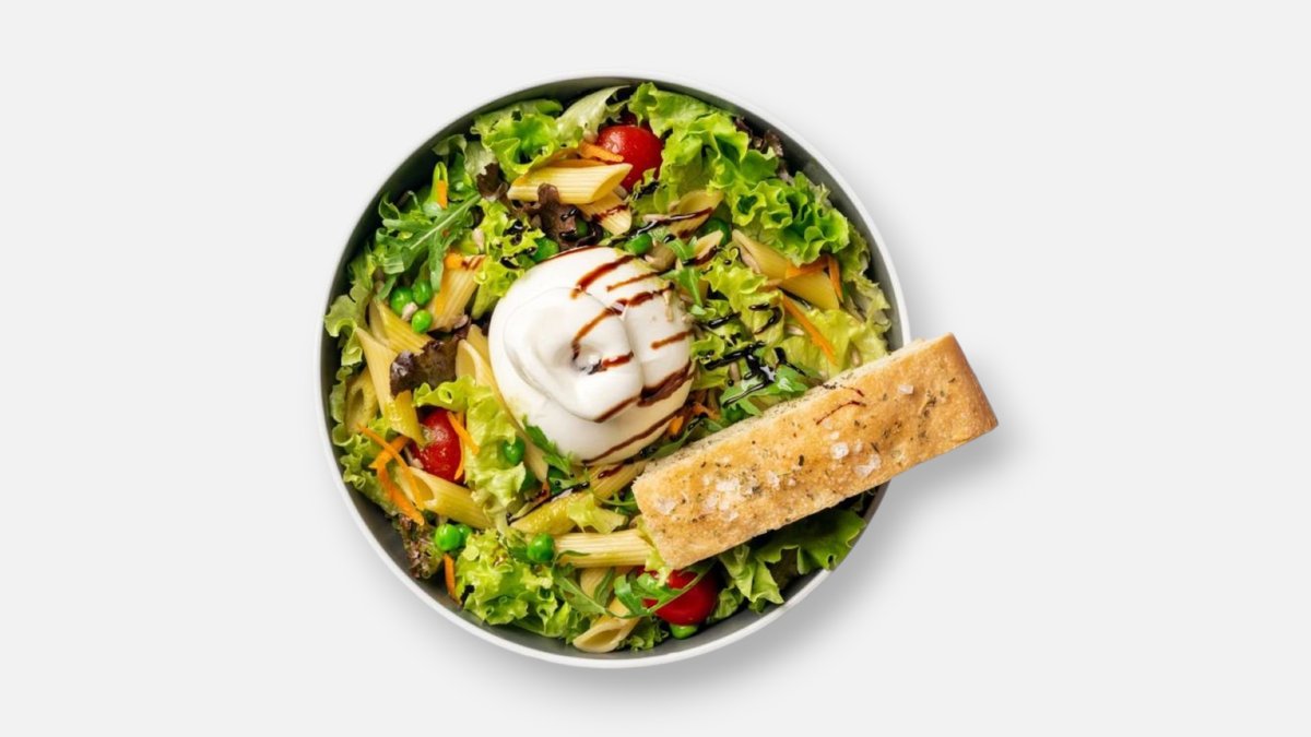 těstoviny penne, mix salátů, rukola, burrata, cherry rajčata s hladkolistou petrželí, hrášek, mrkev, focaccia s bylinkami, slunečnicová semínka, balsamiková redukce, jarní ořechové pesto