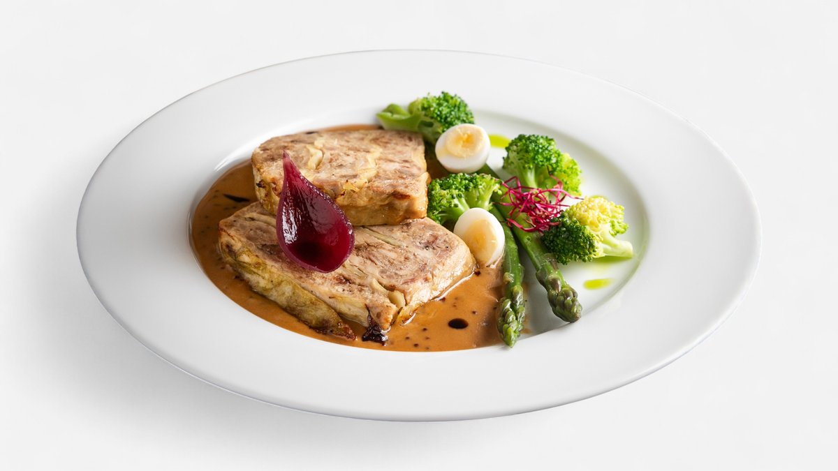 Teplý mozaikový řez ze zelných listů, kachního masa a brambor, pečený vcelku a servírovaný s omáčkou La Rochelle, chřestem a křepelčím vejcem