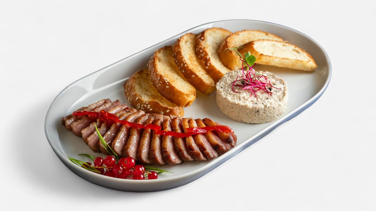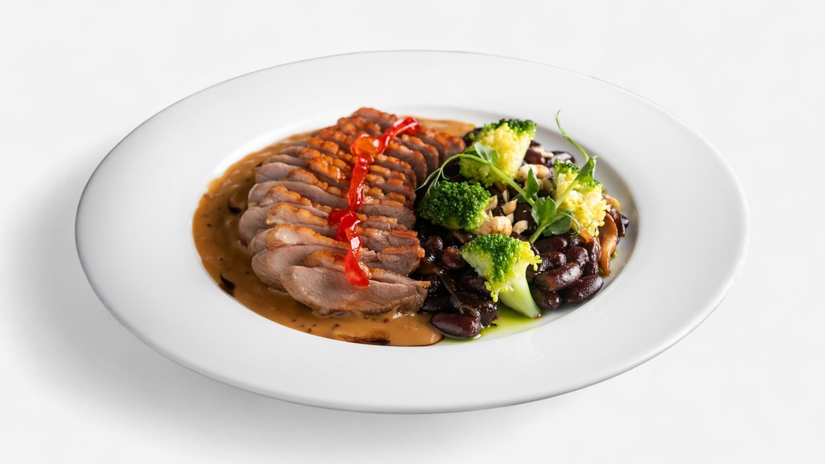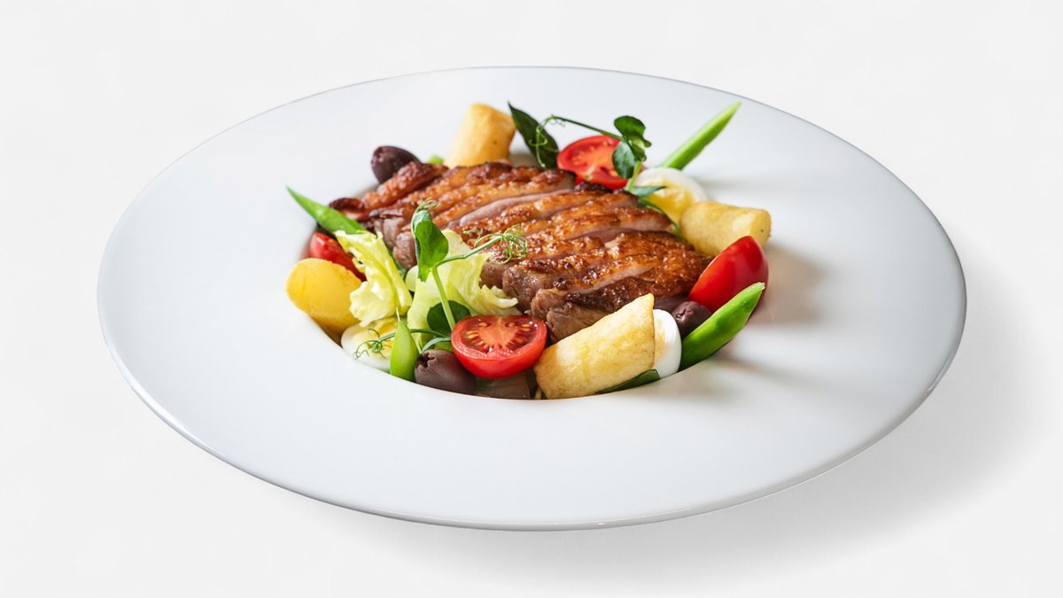 Kachní prso, ledový salát, cherry rajčata, křepelčí vejce, olivy Kalamata, zelený chřest, pečené brambory, středomořská omáčka