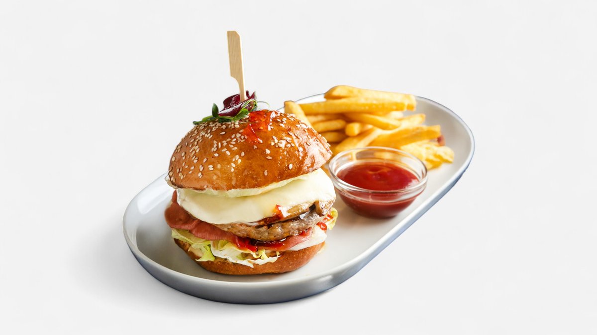 S kachním masem, foie gras, kešu omáčkou, nakládaným jablkem, čedarem a salátem, hranolky