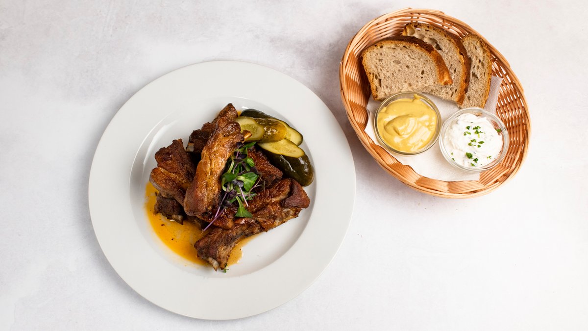 salát coleslaw, BBQ dip, hořčičný dip, čerstvý chlebíček Obrázek je ilustrační