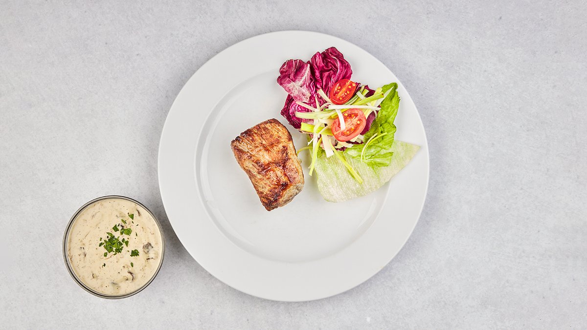 150g Vepřový steak s pepřovou omáčkou a opečenými brambory