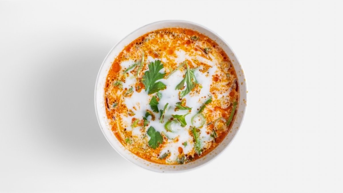 Vývar, kuřecí maso, rýžové nudle, jarní cibulka a koriandr (a 6)
