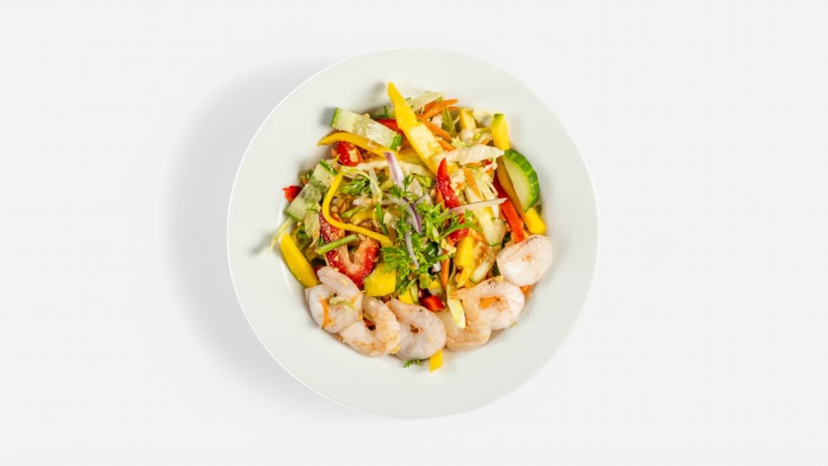Mango, krevety, ledový salat, rajčata, okurky (a 2)
