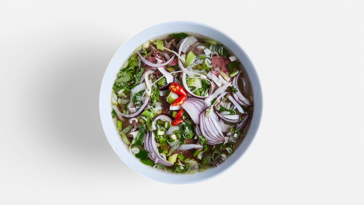 Vývar, hovězí maso, rýžové nudle, jarní cibulka a koriandr (a 6)
