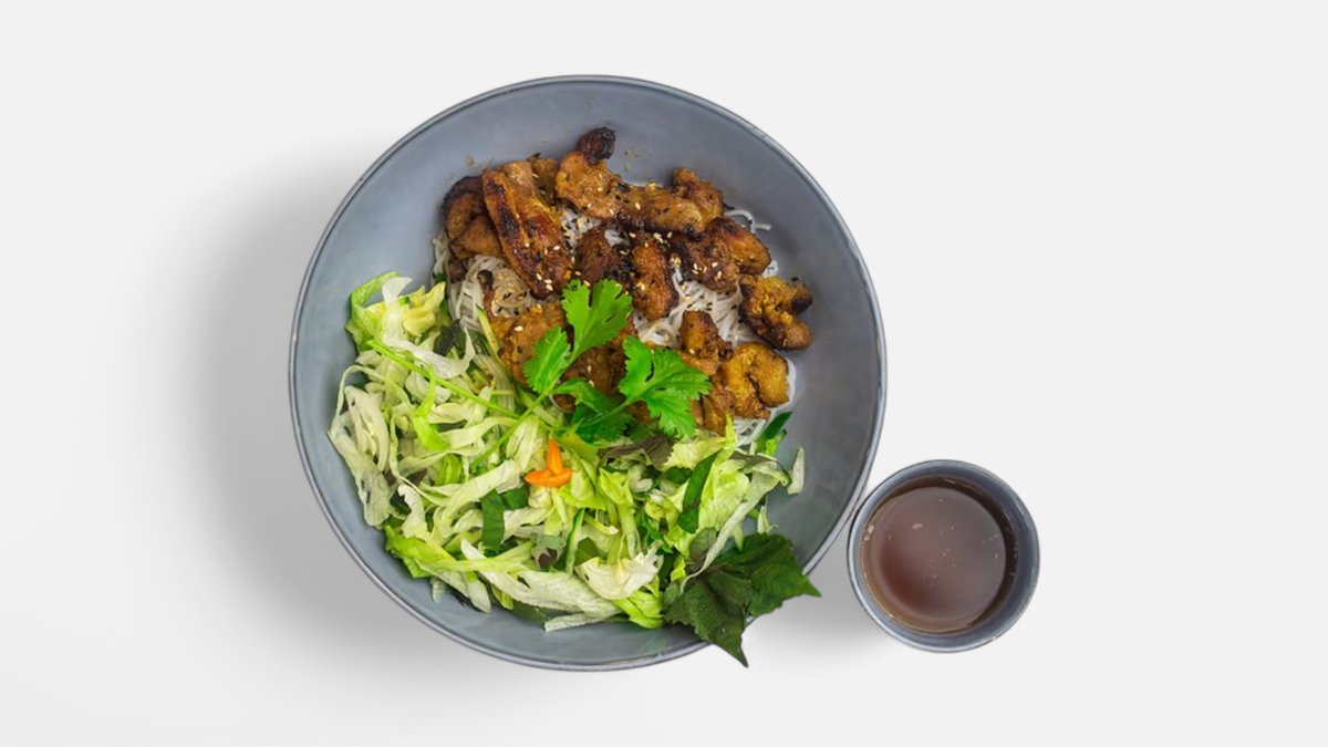 Grilované vepřové maso, rýžové nudle, salat, okurky a koriandr omáčka, (a 11)