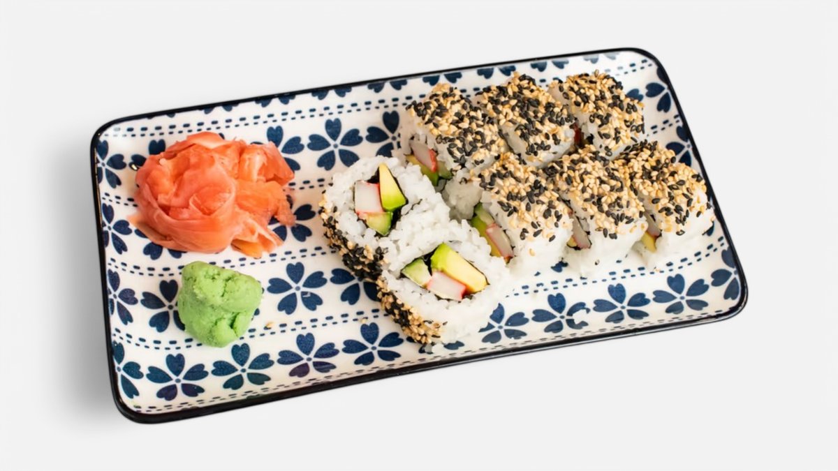 Nigiri (avokádo, tamago, ředkev), maki (okurka, avokádo, ředkev), tempura vegan