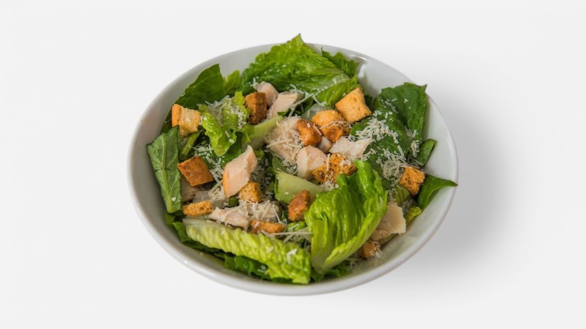 300 g, kuřecí maso, listový salát, parmazán, krutony, dresink