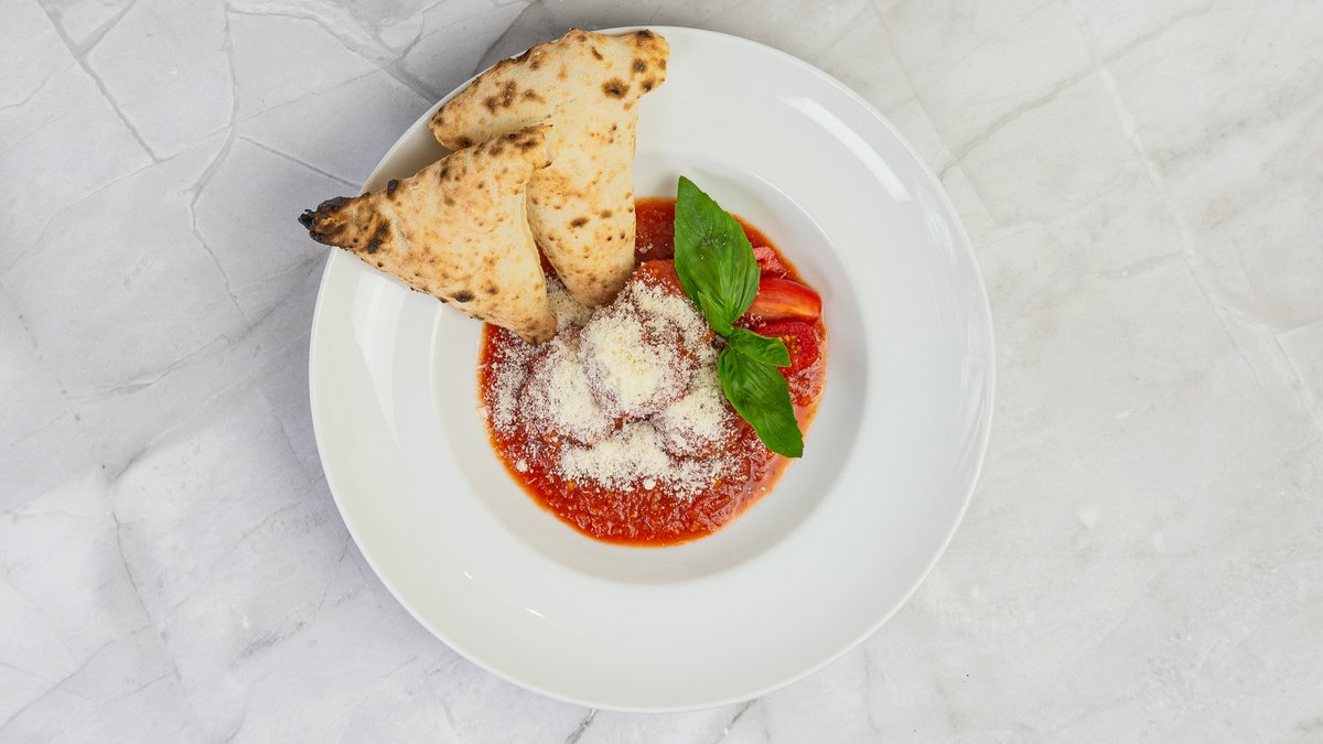 masové koule, tomatová omáčka, pecorino