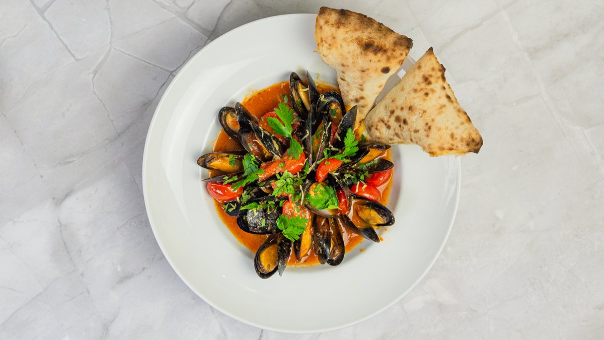 Mušlová polévka, slávky, cherry rajčata, víno, focaccia