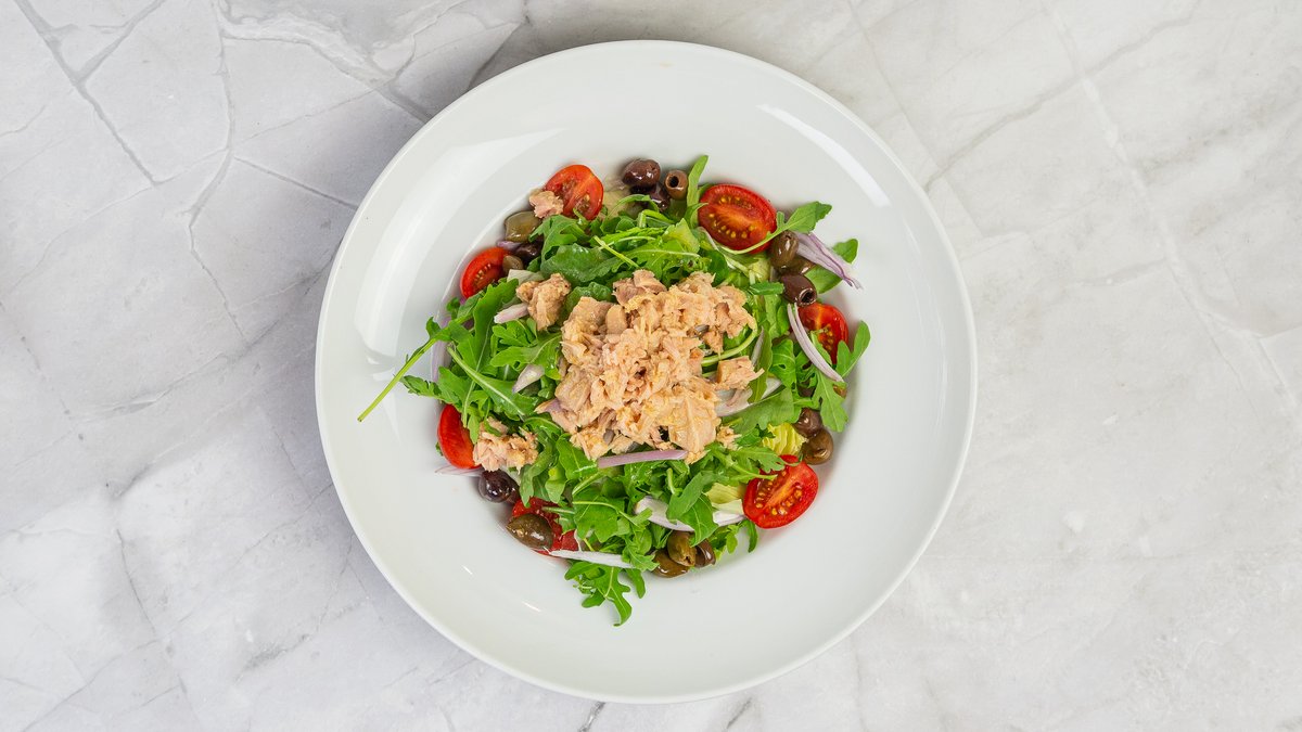 Tuňák, zelené saláty, šalotka, chery rajčata, černé olivy