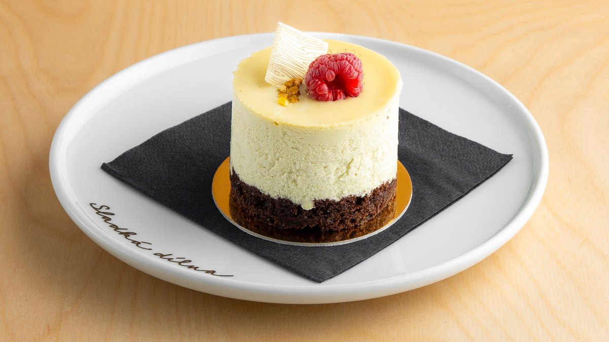 Vláčný světlý piškot s krémem z krémového sýra, smetany, bílé čokolády a pistáciové pasty.
