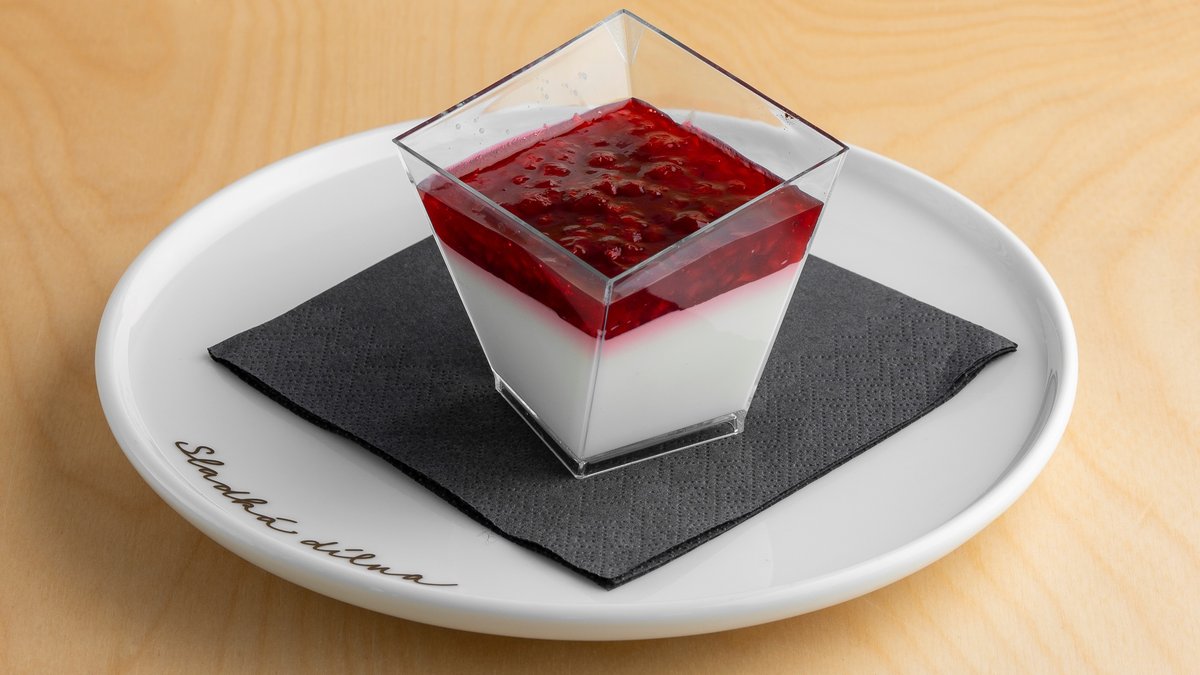Jemný smetanový dezert s přírodním vanilkovým extraktem s ovocným coulis. Výběr ovoce záleží na sezóně nebo dostupnosti surovin. Nejčastěji používáme jahodu, malinu nebo lesní směs.