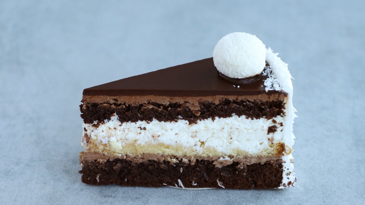 Čokoládový a světlý piškot s lahodným kokosovým krémem, křupkami, ganáží ze smetany a hořké čokolády a našimi kokosovými kuličkami s mandlí uvnitř.
