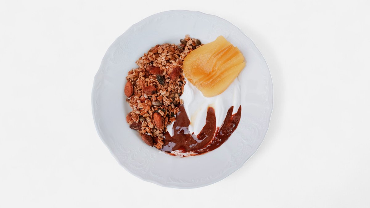 ořechy, semínka, řecký jogurt, pečené švestky se skořicí a badyánem a pekanové máslo. alergeny: 1,7,8