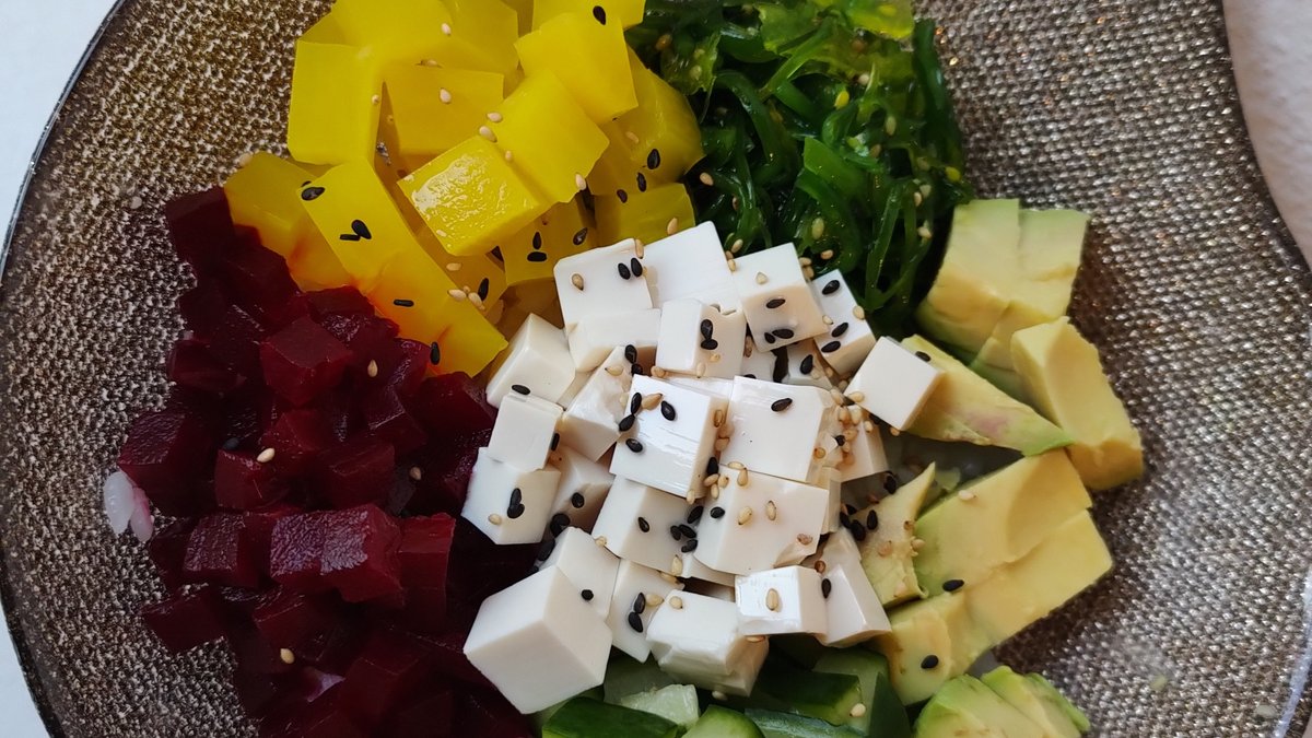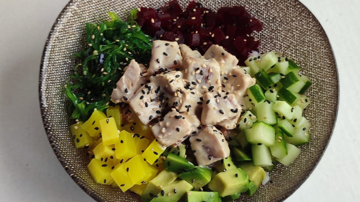 rýže, tuňák syrový marinovaný, avokádo, goma wakame, okurka, červená řepa, oshinko, sezam, dresing