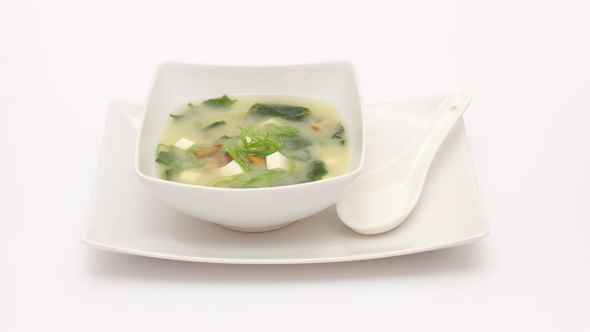 tradiční japonská polévka ze sojových bobů, mix ryb, řasy wakame, houbičky Nameko, sýr tofu, jarní cibulka