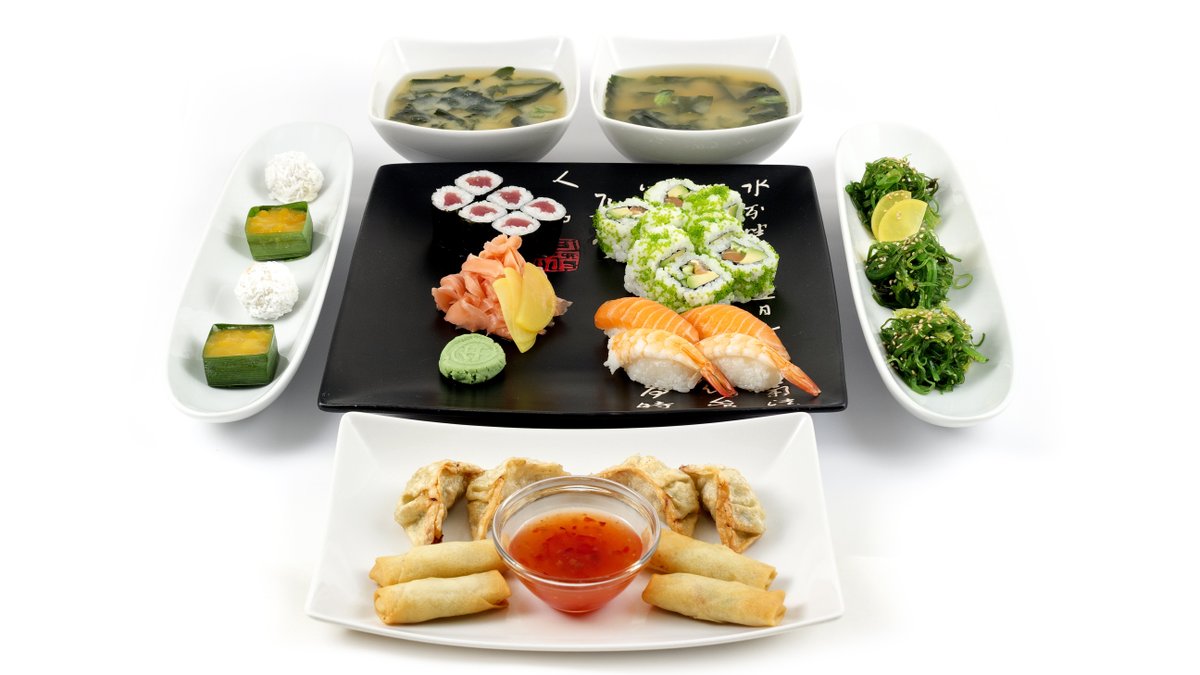 Goma wakame salát 2x , polévka Tom Yum 2x, California sezam (8ks), sake maki (6ks), tekka maki (6ks), sake nigiri (2ks), maguro nigiri (2ks), horse saba nigiri (2ks), Ebi nigiri (2ks), dezert - mochi 2ks, mangový košíček 2ks, kokosová kulička 2ks
