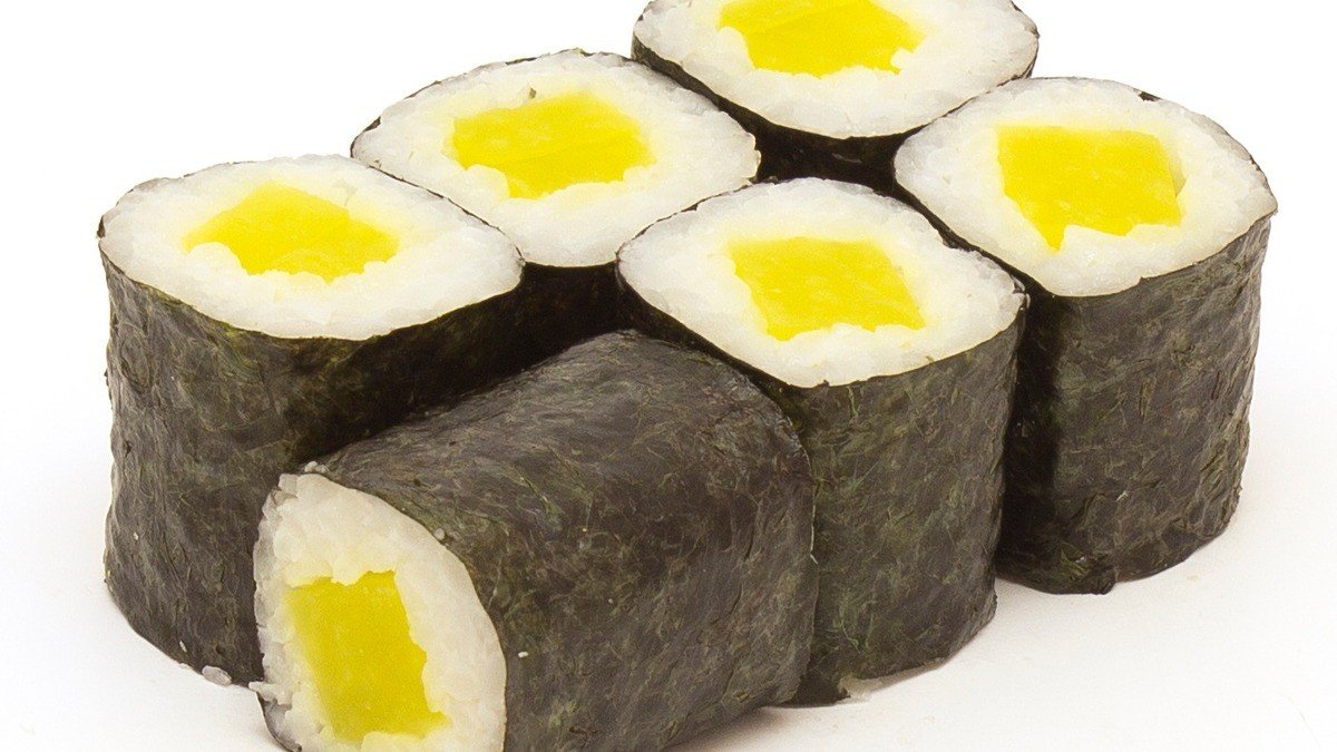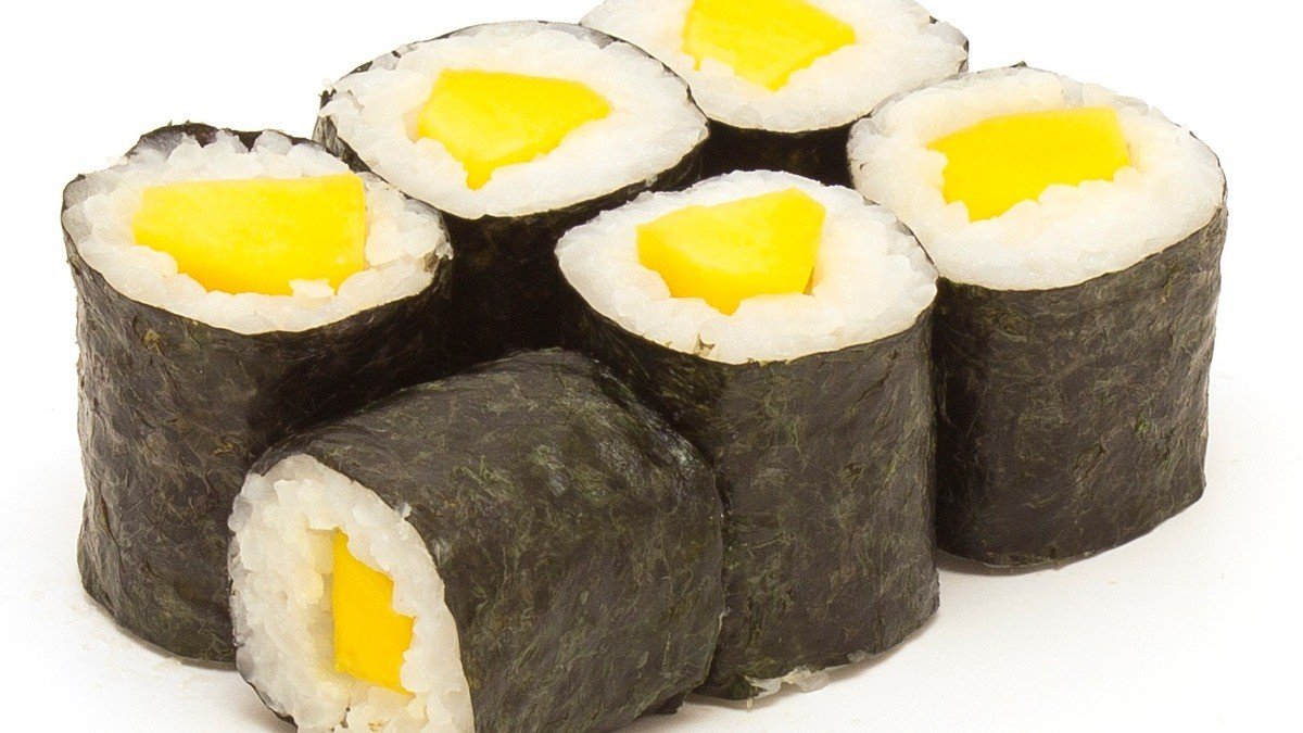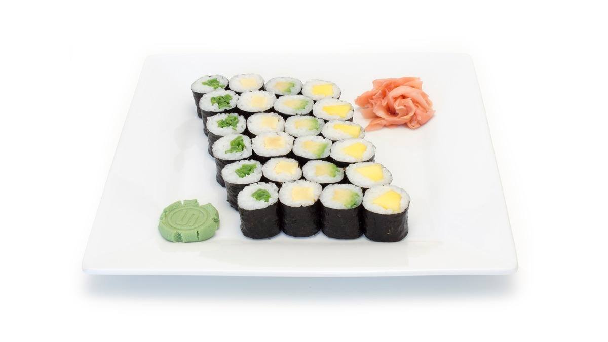 sushi - 6 ks tamago maki, 6 ks mango maki, 6 ks avocado maki, 6 ks okurka maki (vaječná omeleta, mango, avokádo, okurka)