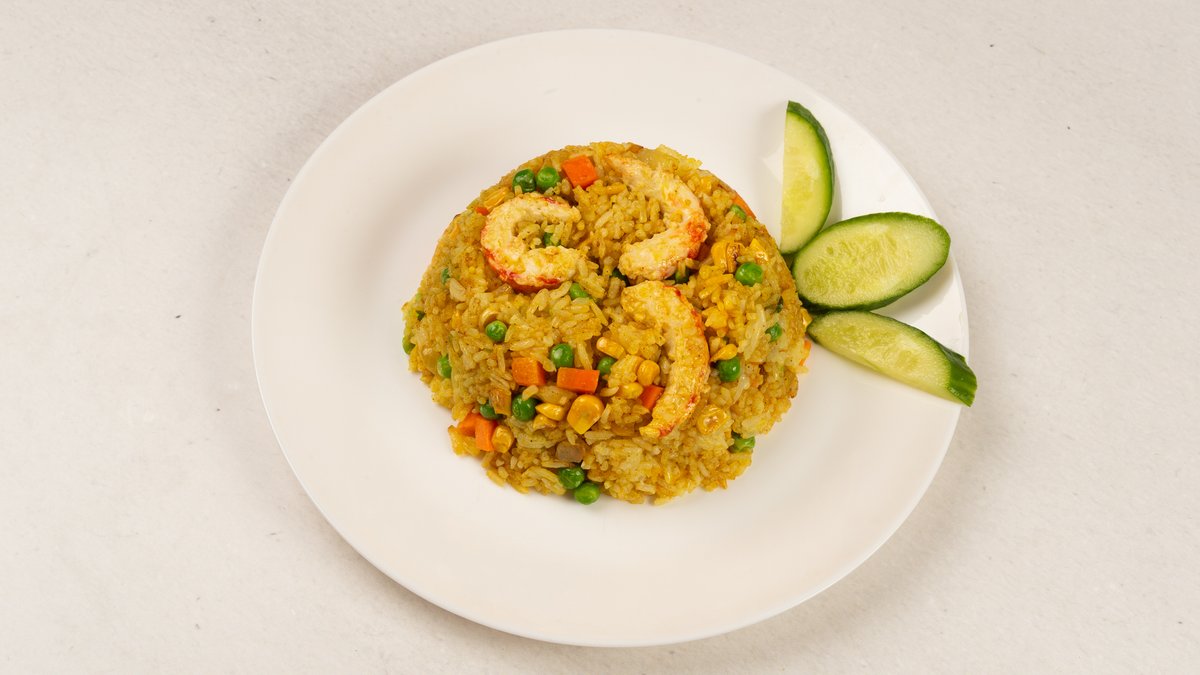 zeleninové rizoto s lahodnými vegan krevetami složení: rýže, mrkev, cibule, hrášek, kukuřice, sójové krevety, kari, kurkuma, asijské koření
