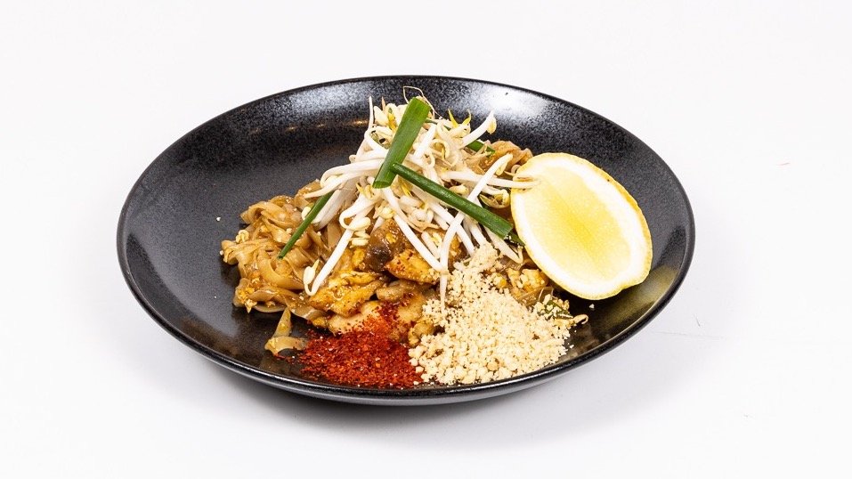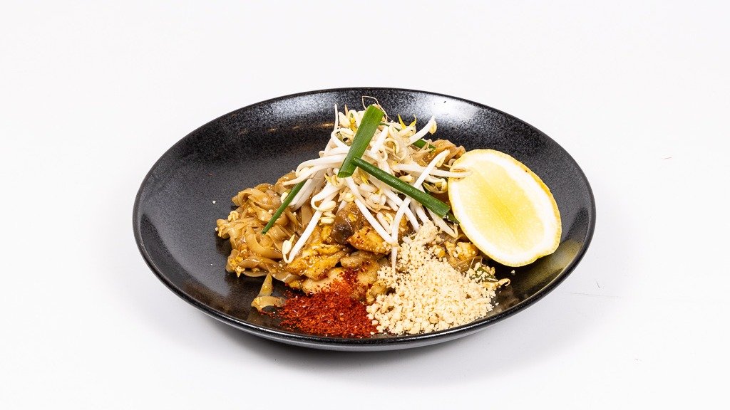 Rýžové nudle restované s vejci, kuřecí maso, tamarindová šťáva, rybí omáčka, česnek, šalotka, chilli, palmový cukr, limetka a arašídy