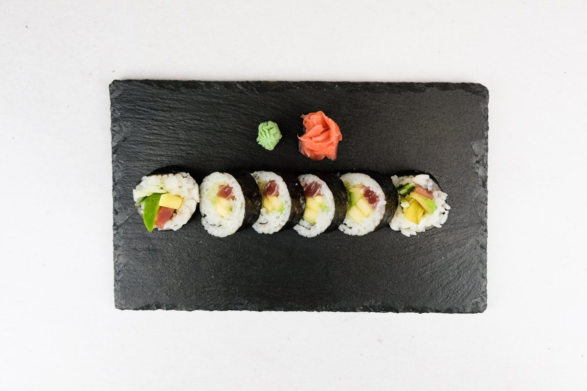 krab, avokádo, okurka, plátky lososa a tuňák bks,