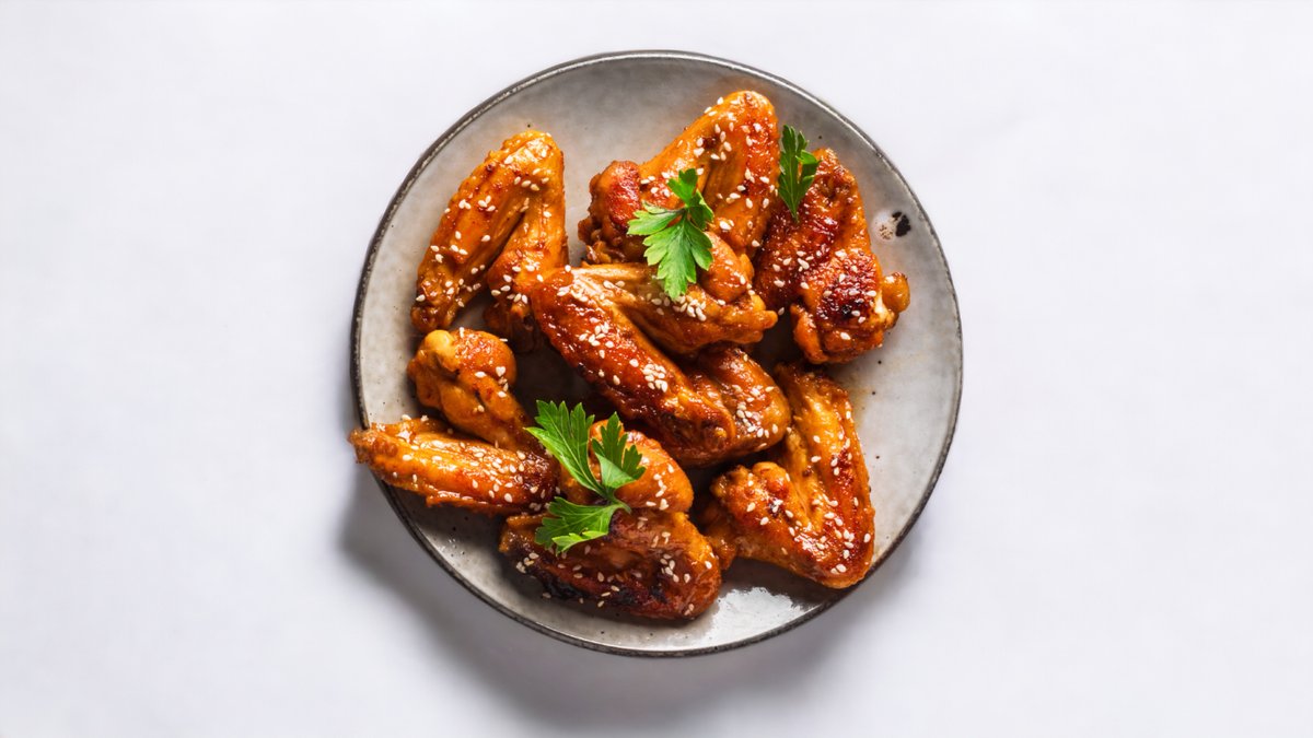 vykostěné maso s teriyaki omáčkou, restovaným bílým a červeným zelím, cibule, sójové klíčky a mrkví, sypaný sezam